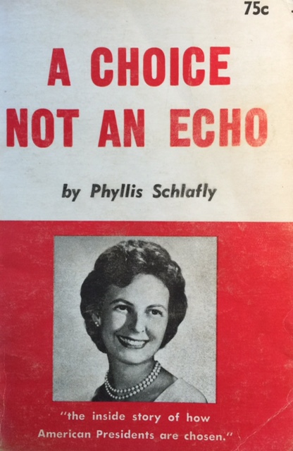 Phyllis Schlafly’s conservative manifesto, A Choice, Not an Echo, has a quote on the cover that is as fresh today as when it was first published in May 1964. Under a picture of the author (in perfectly styled hair and two strings of pearls) a caption promises to tell “the inside story of how American Presidents are chosen.” Comparing GOP leaders to Paris couturiers who “brainwash” unthinking female consumers, she revealed in the introduction that the presidential nominating process had been stolen from the people. Between 1936 and 1960, she wrote, “a few secret kingmakers based in New York selected Republican presidential nominees…and successfully forced their choice on a free country where there are more than 34 million voters.”